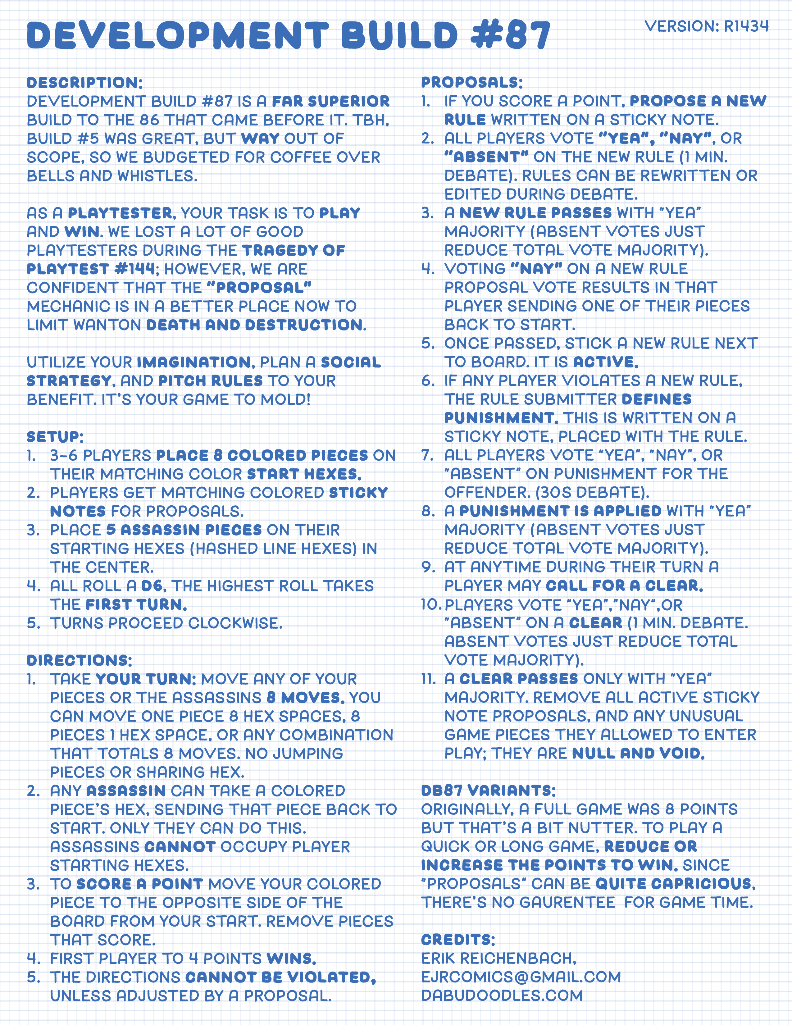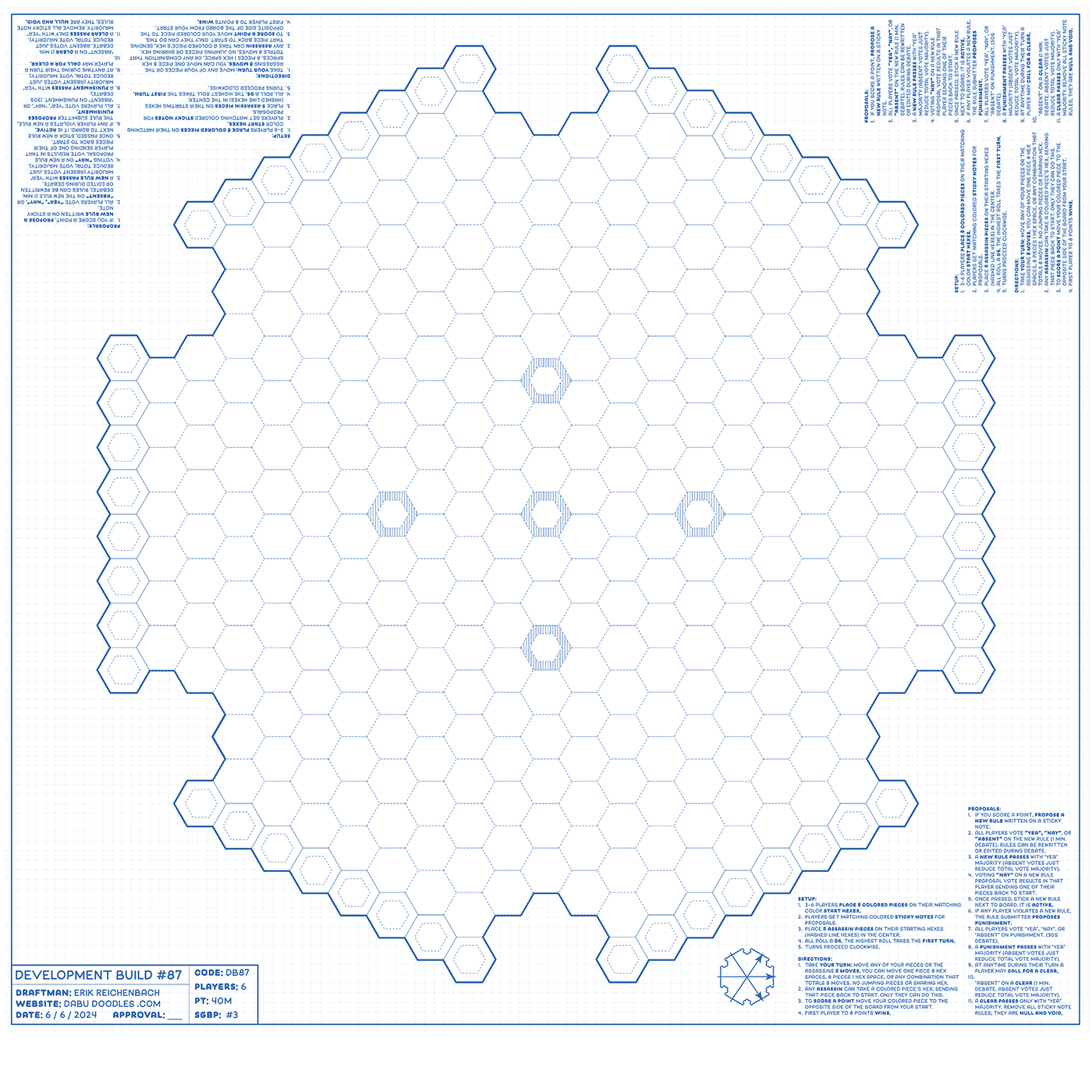 Have you ever played a game and thought, "I could make this better"? Development Build 87 (DB87) takes that idea and makes it the core mechanic. This unique party game is a social experiment on a tabletop, where players aren't just following rules—they're creating them. My work on DB87 was an exhilarating exercise in game design, translating a highly dynamic, player-driven concept into a physical board game complete with a board, pieces, and a rulesheet.