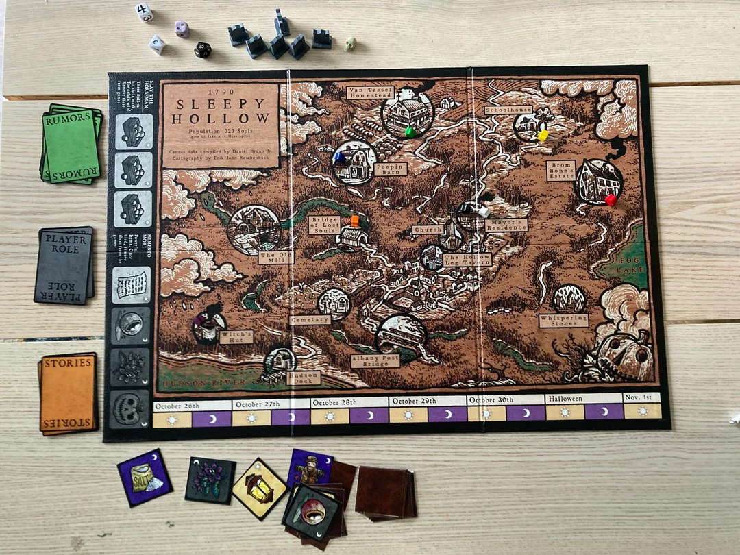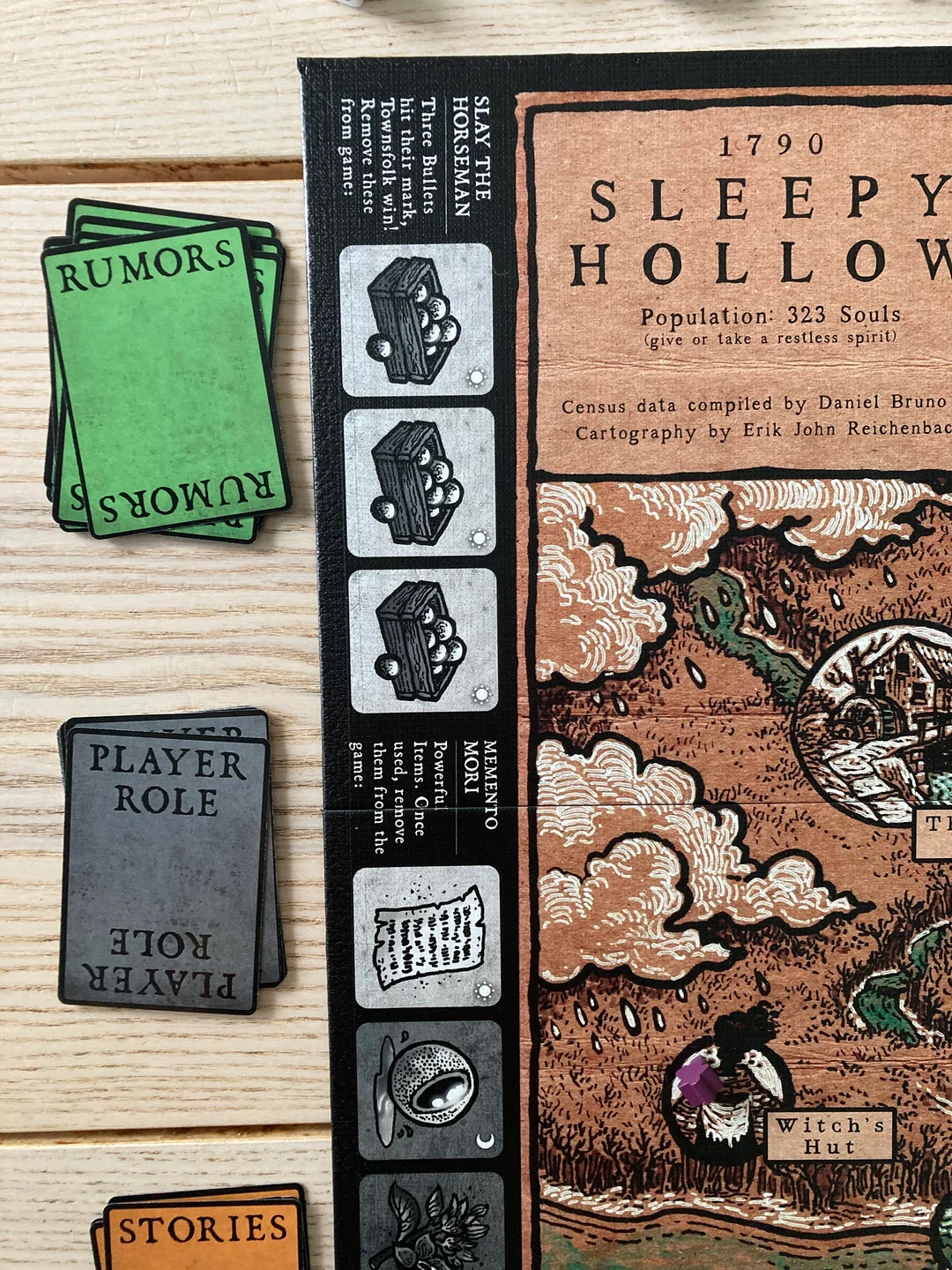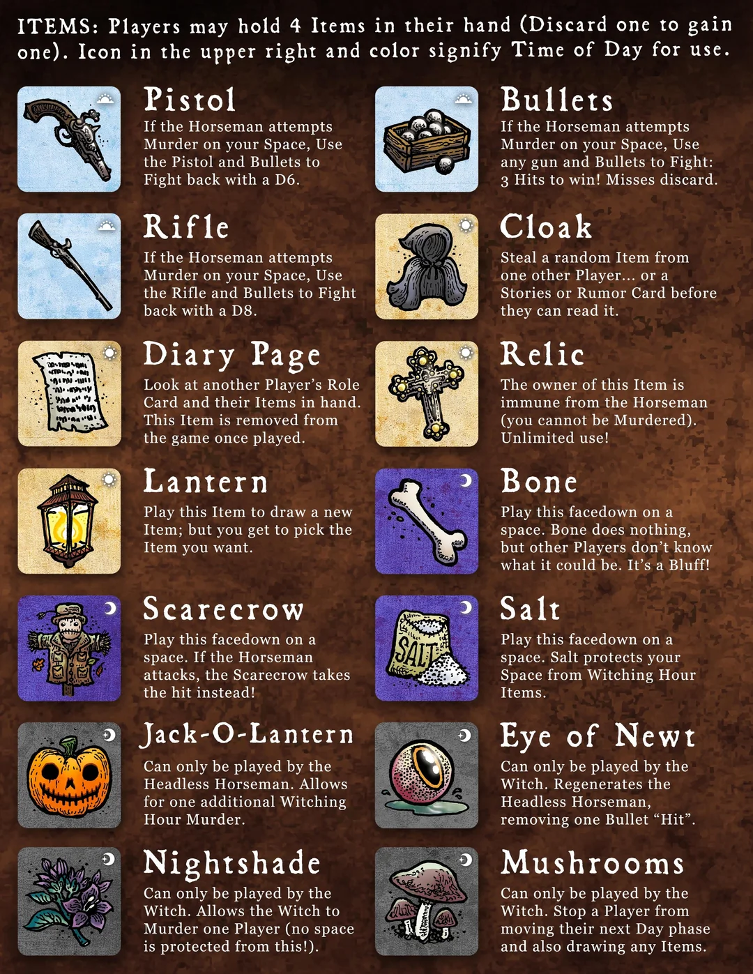 The game challenges players to navigate the shifting loyalties of a classic American legend. Players are secretly assigned one of three roles: the Humble Townsfolk, the nefarious Headless Horseman, or the cunning Witch. Each role has a unique objective, creating a web of alliances and betrayals that changes with every move. I designed and illustrated every component of this game, from the town map gameboard that evolves from October 26th to All Saints' Day, to the unique cards and item pieces.